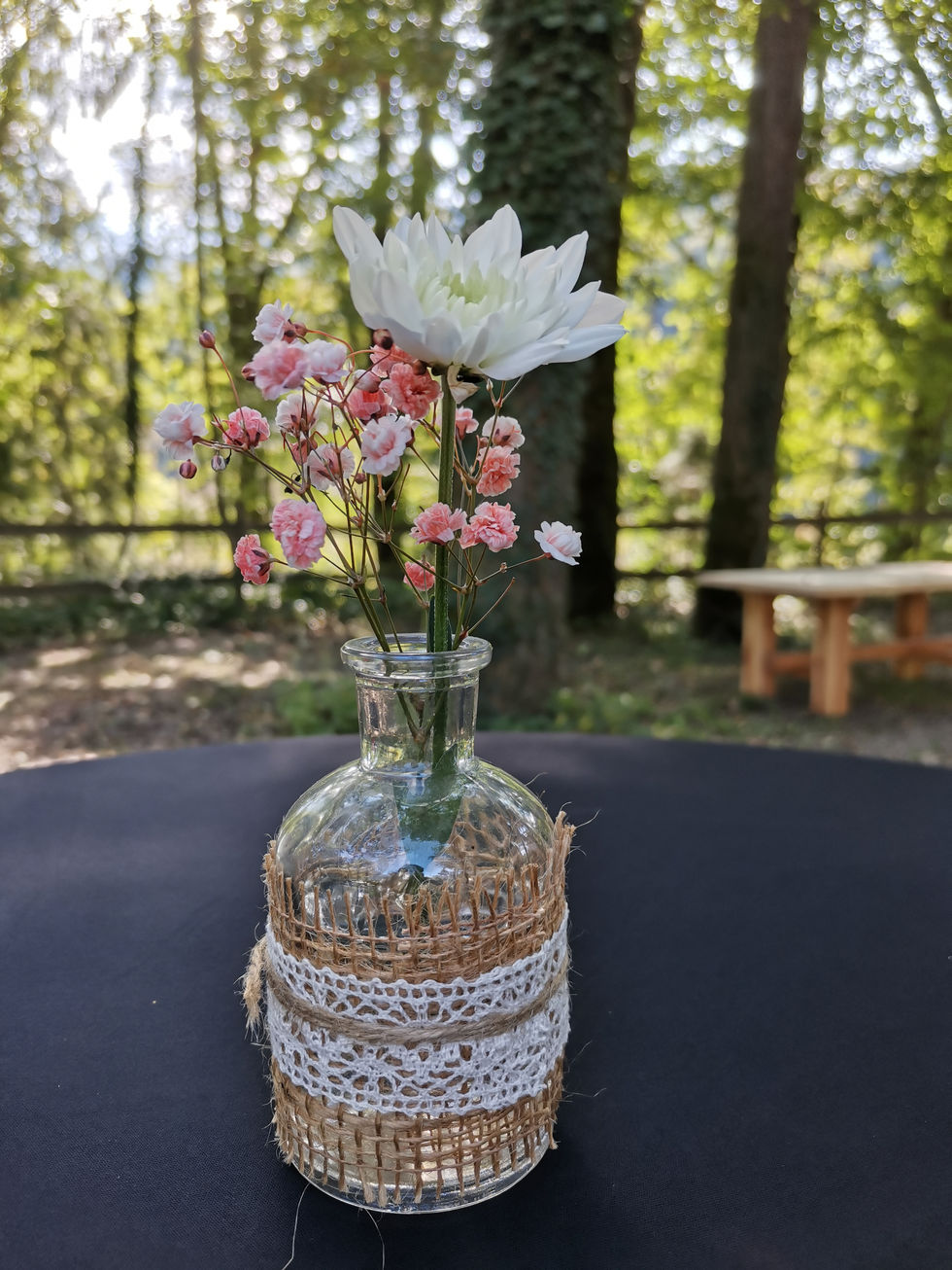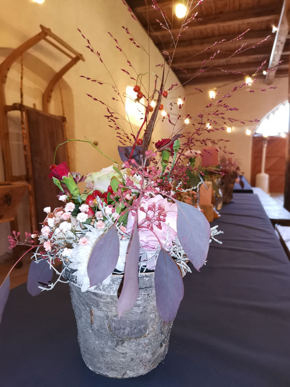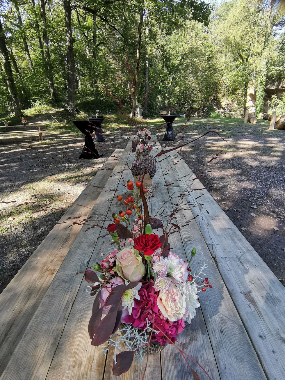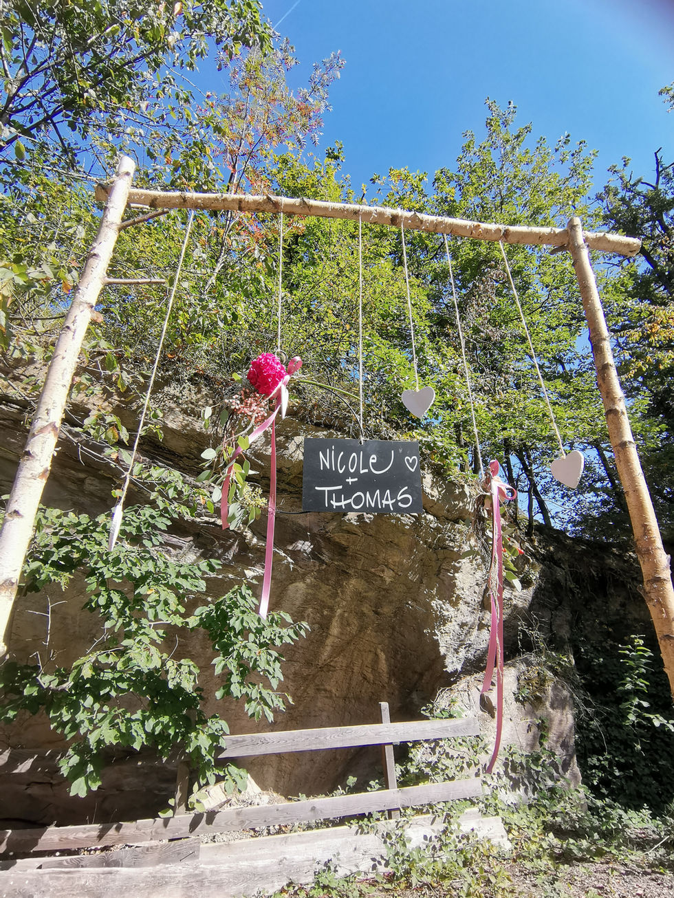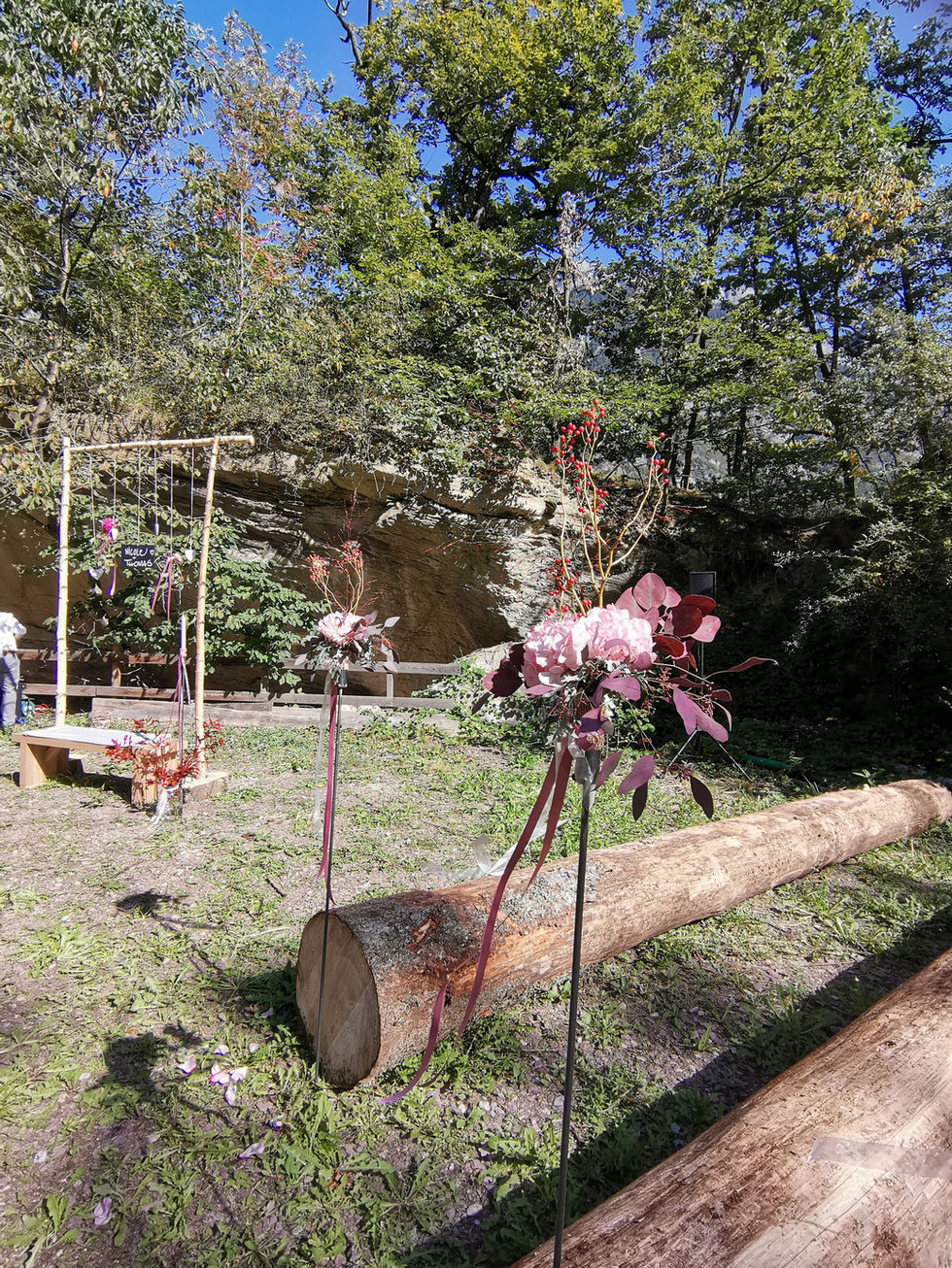 A herbstlichi Trauig unter freiem Himmel und aschlüssender Fiir. Dia Hochzits Deko het miar bsundrigs viel Spass gmacht, denn meh mit de Natur verbunda got gar nid.